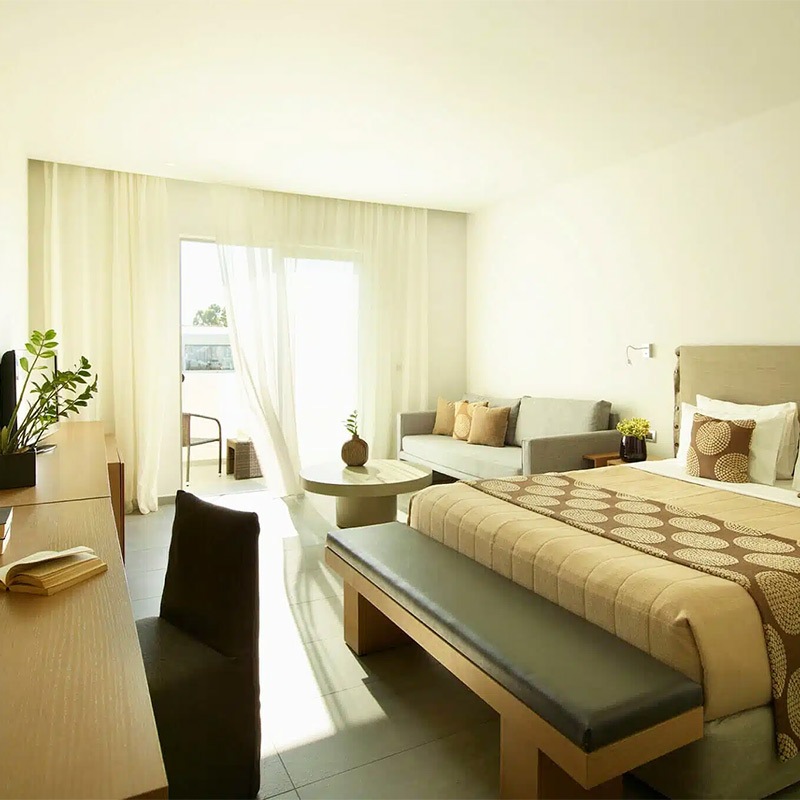 Elle est équipée de : 1 lit double king-size, canapé, balcon ou terrasse aménagé, climatisation, télévision, téléphone, mini réfrigérateur, coffre-fort, machine à café/thé, Wi-Fi, salle de bains avec baignoire, sèche-cheveux, peignoirs et chaussons.